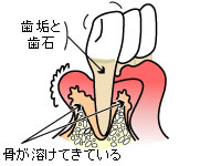 しかも知らない間に進行し、気付いたときは手遅れで、一度に何本も抜けることが多く被害は甚大です。歯の表面には、食事のたびにネバネバした薄い膜状のものが作られますが、これが歯垢(プラーク)と呼ばれる細菌の塊です。歯垢は石灰化すると硬い歯石になり、自分では取り除くことができません。歯垢1ミリグラムには、細菌が1億個もいるといわれ、これが歯肉に炎症を起こし、最後は歯を支える歯槽骨まで溶かしてしまいます。支えを失った歯は、まとまって抜け落ちてしまいます。